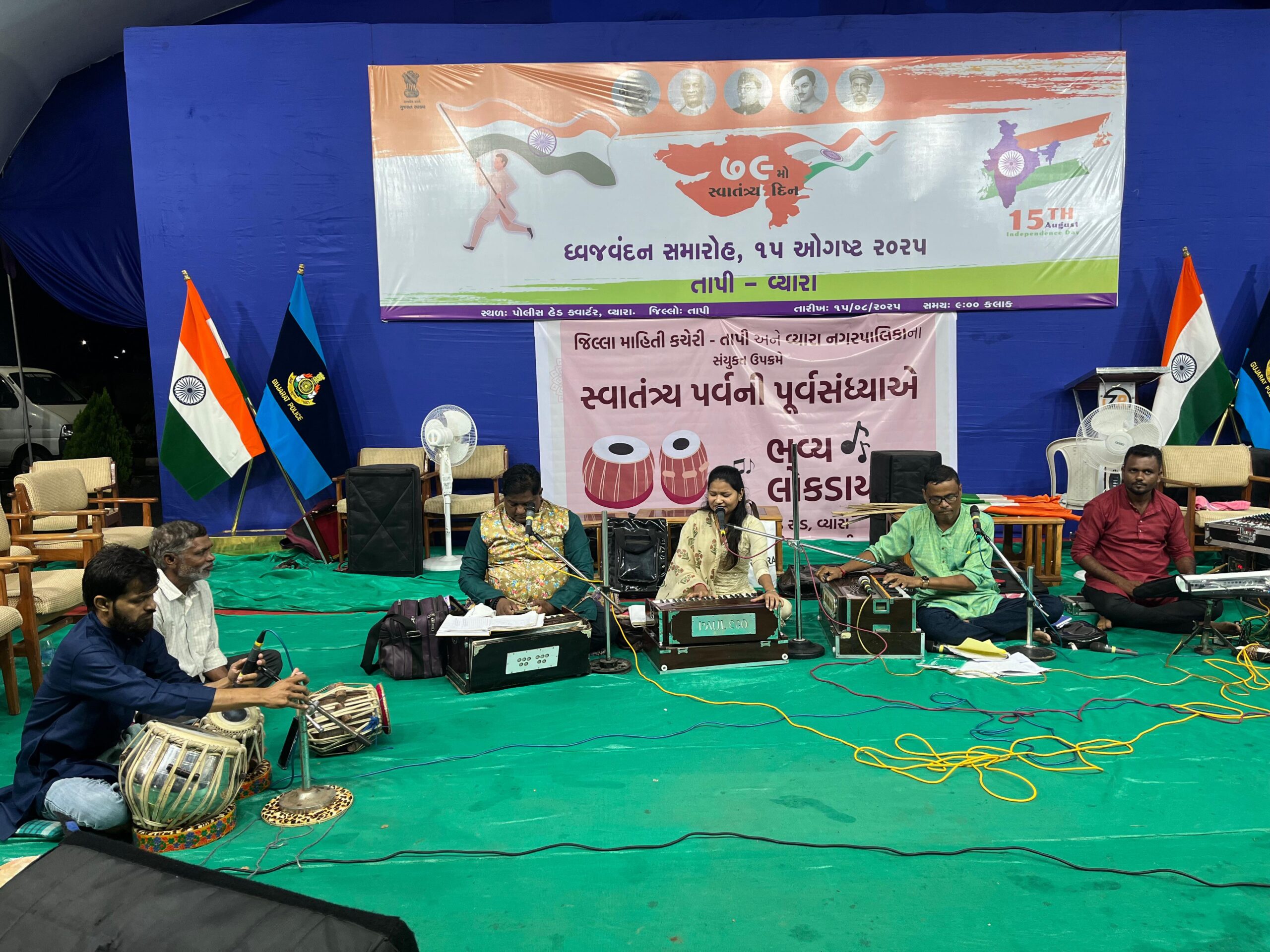 તાપી જિલ્લાના મુખ્ય મથક વ્યારા પોલીસ પરેડ ગ્રાઉન્ડ ખાતે ૧૫મી ઓગષ્ટ ૨૦૨૫ ના રોજ ૭૯માં સ્વાતંત્ર્ય પર્વ ની ઉજવણી રાજ્યના આદિજાતિ વિકાસ મંત્રીશ્રી કુંવરજીભાઈ હળપતિના વરદ્ હસ્તે ધ્વજ વંદન કાર્યક્રમ યોજાયો હતો. ‘ *સ્વાતંત્ર્ય પર્વ ૨૦૨૫* ‘ની પૂર્વ સંધ્યાએ તા.૧૪/૦૮/૨૦૨૫ ના રોજ સાંજે ૭-૦૦ કલાકે તાપી જિલ્લા માહિતી કચેરી અને વ્યારા નગરપાલિકાના સંયુક્ત ઉપક્રમે શિવાજી ચોક, ખાતે લોકડાયરાનું આયોજન કરવામાં આવ્યું હતું.પરંતુ વરસાદી માહોલ વચ્ચે પોલીસ પરેડ ગ્રાઉન્ડ ખાતે ભવ્ય *લોકડાયરો* યોજાયો હતો.