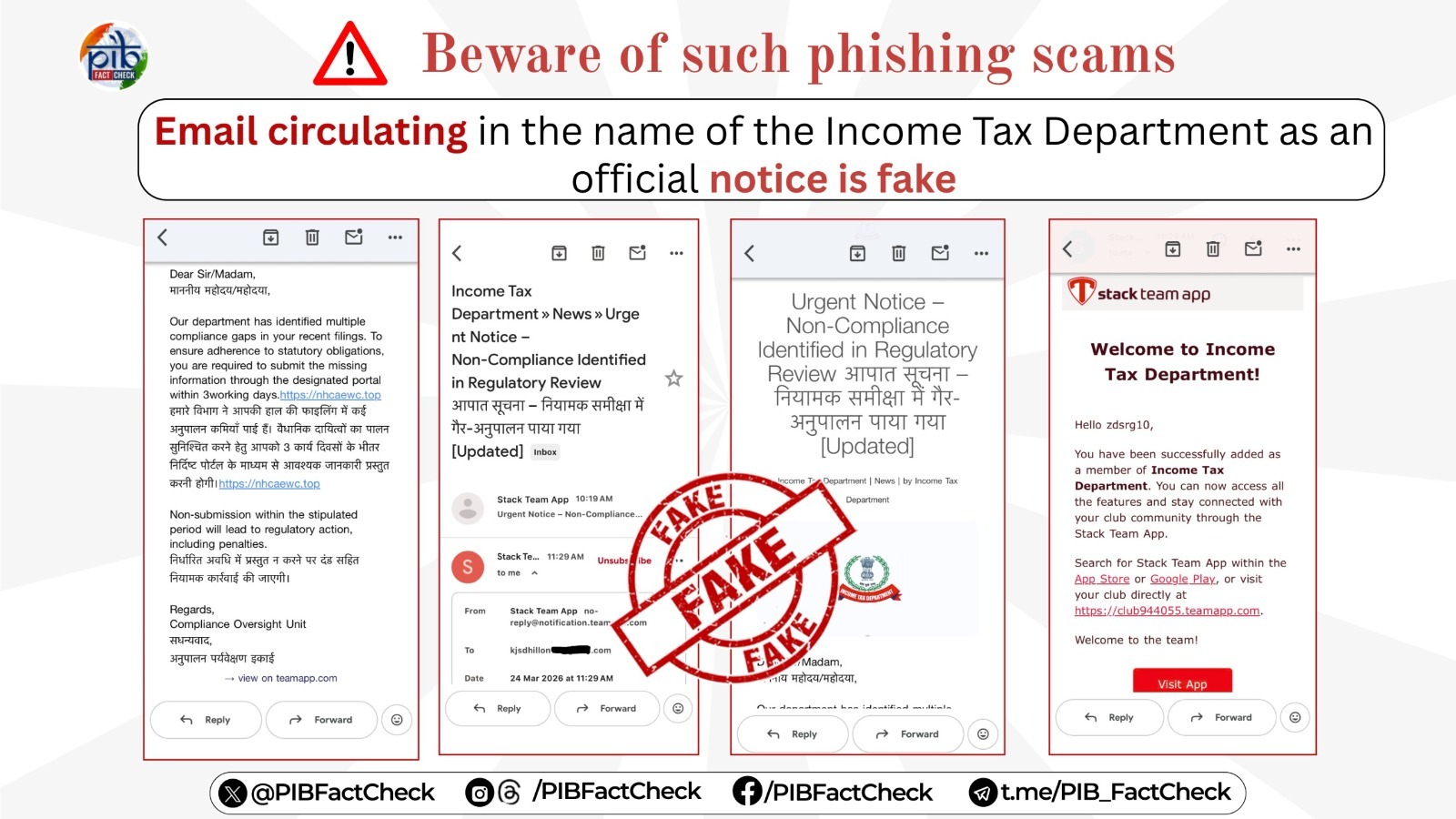 સરકારી ફેક્ટ ચેક સંસ્થા PIB એ સ્પષ્ટતા કરી છે કે,આવકવેરા વિભાગ દ્વારા આવો કોઈ જ ઇમેઇલ મોકલવામાં આવ્યો નથી.વાયરલ થઈ રહેલો આ સ્ક્રીનશોટ તદ્દન ખોટો અને ભ્રામક છે. આ એક ‘ફિશિંગ એટેક’ છે, જેનો હેતુ તમારી અંગત અને નાણાકીય વિગતો ચોરી કરવાનો છે.
