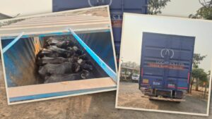 સોનગઢના માંડળ ટોલનાકા પાસેથી પોલીસે ક્રૂરતાપૂર્વક કન્ટેનરમાં ભરીને લઈ જવાતી ૧૮ ભેંસોને મુક્ત કરાવી છે. આ મામલે પોલીસે કુલ રૂ.૧૨.૬૦ લાખનો મુદ્દામાલ જપ્ત કરી બે શખ્સોની ધરપકડ કરી છે, જ્યારે કન્ટેનર માલિકને વોન્ટેડ જાહેર કર્યો છે.મળતી માહિતી પ્રમાણે તા.૧૭મી નારોજ વ્યારાથી સોનગઢ તરફ આવતા ટ્રેક પર માંડળ ટોલનાકા પાસે એક અશોક લેલન ટ્રક (કન્ટેનર) નંબર જીજે/૧૮/એડબ્લ્યુ/૮૬૯૨ને અટકાવવામાં આવ્યું હતું. તપાસ દરમિયાન કન્ટેનરના પાછળના ભાગે ૧૮ જેટલી બાખડી ભેંસોને ટૂંકા દોરડા વડે અત્યંત ક્રૂરતાપૂર્વક, ઘાસચારા કે પાણીની વ્યવસ્થા વગર બાંધેલી હાલતમાં મળી આવી હતી.