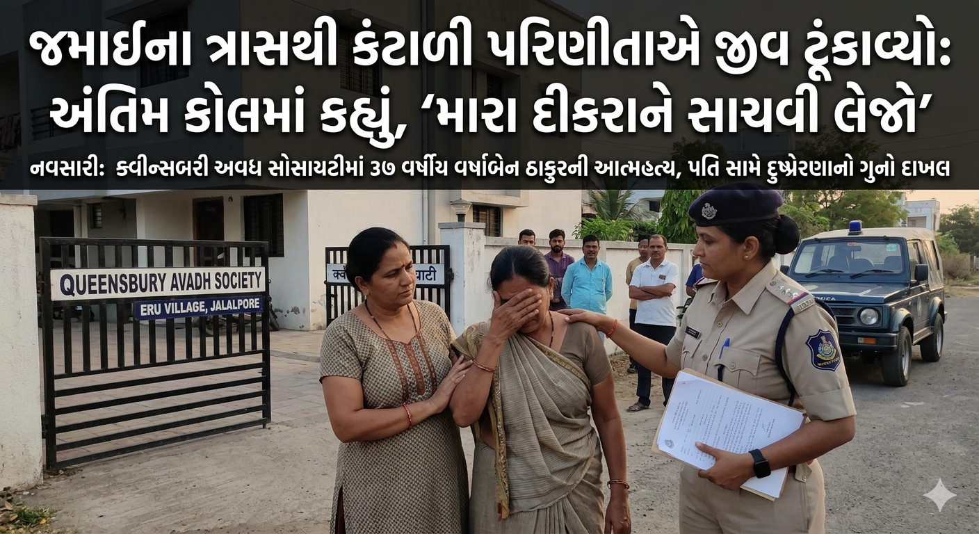 નવસારી : જલાલપોરના એરૂ ગામમાં આવેલી ક્વીન્સબરી અવધ સોસાયટીમાં એક હૃદયદ્રાવક ઘટના સામે આવી છે. લગ્નના ૧૧ વર્ષ બાદ પણ પતિના શારીરિક અને માનસિક ત્રાસથી કંટાળી ૩૭ વર્ષીય પરિણીતા વર્ષાબેન ઠાકુરે ગળે ફાંસો ખાઈ આત્મહત્યા કરી લીધી છે. મળતી વિગતો પ્રમાણે મૂળ મહારાષ્ટ્રના અને હાલ જલાલપોરમાં રહેતા મંગેશભાઈ રવિન્દ્રભાઈ ઠાકુર સામે તેની સાસુ સત્વશીલાબેન દેશમુખે ફરિયાદ નોંધાવી છે. ફરિયાદ મુજબ, વર્ષાબેન અને મંગેશભાઈના લગ્ન ૨૦૧૫માં થયા હતા. લગ્ન બાદથી જ પતિ નાની-નાની વાતોમાં ઝઘડો કરી વર્ષાબેનને મારપીટ કરતો અને માનસીક ત્રાસ આપતો હતો.